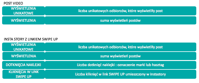 W przypadku postów video w feedzie, wskaźnik „wyświetlenia” to liczba unikatowych wyświetleń posta video. W statystykach tego samego posta w pozycji „wyświetlenia” znajdziemy natomiast sumę wszystkich wyświetleń tego posta. Ta liczba zawsze jest większa, bo tak jak w przypadku postów ze zdjęciem, niektórzy odbiorcy wyświetlają video częściej niż raz.