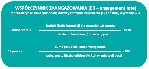 Zaangażowanie jest ściśle związane z tzw. wskaźnikiem zaangażowania. To taki wspólny mianownik służący prostemu porównaniu infuencerów. W zależności od liczby fanów i dokonanych przez nich interakcji możemy stwierdzić, który był skuteczniejszy.