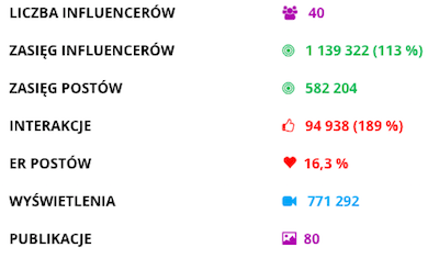Zasięg kampanii: w kampanii łącznie udział wzięło 40 influencerow, o łącznym zasięgu na poziomie ponad 1 mln obserwujących.