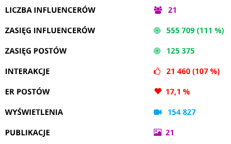 Zasięg kampanii: KPI zasiegowy tej kampanii wynosił 500 tyś. i został zrealizowany z nadwyżką dzięki współpracy z grupą 21 influencerów